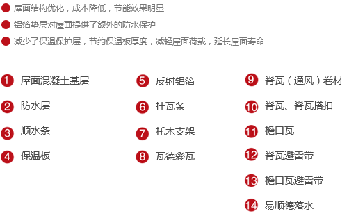 作為傳統(tǒng)屋面通風(fēng)方案的優(yōu)化,鋁箔墊層的加入,使反射鋁箔與嵌入順?biāo)畻l間的保溫板形成空氣間層,代替了部分保溫板厚度,而且省去了保溫保護(hù)層。